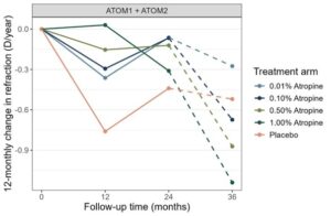 Figure 1: Mean rates of change in refractive error in D/year across treatment arms of the ATOM1 and ATOM2 studies during the treatment phase (solid lines, baseline to 24 months) and after ceasing treatment (dashed lines, 24 to 36 months). Note, rates of change must be faster (more negative) than the placebo group to indicate rebound progression.